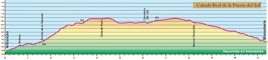Nuestro camino cambia y las encinas dan paso a los pinos y el ascenso a la llanura. Por esta agradable zona en 2 km llegaremos a la carretera, la cual cruzamos para seguir por una pista más empedrada, ascendente y de escasa vegetación que nos abre agradables panorámicas. En el PK 8,4 y antes de comenzar el descenso encontraremos un sendero que nos llevará al alto de la Torrecilla a la izquierda y a Arbancón a la derecha (ruta de enlace).