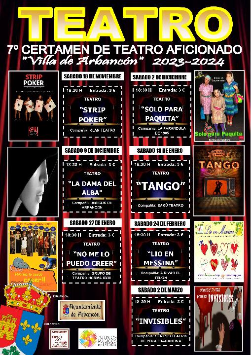 El próximo 18 de Noviembre arranca la edición numero 7 del Certamen de Teatro Aficionado Villa de Arbancón. Un evento ya imprescindible en el calendario de otoño-invierno de la zona que pretende acercar la cultura de calidad al medio rural y crear dinamismo fuera de las épocas estivales.